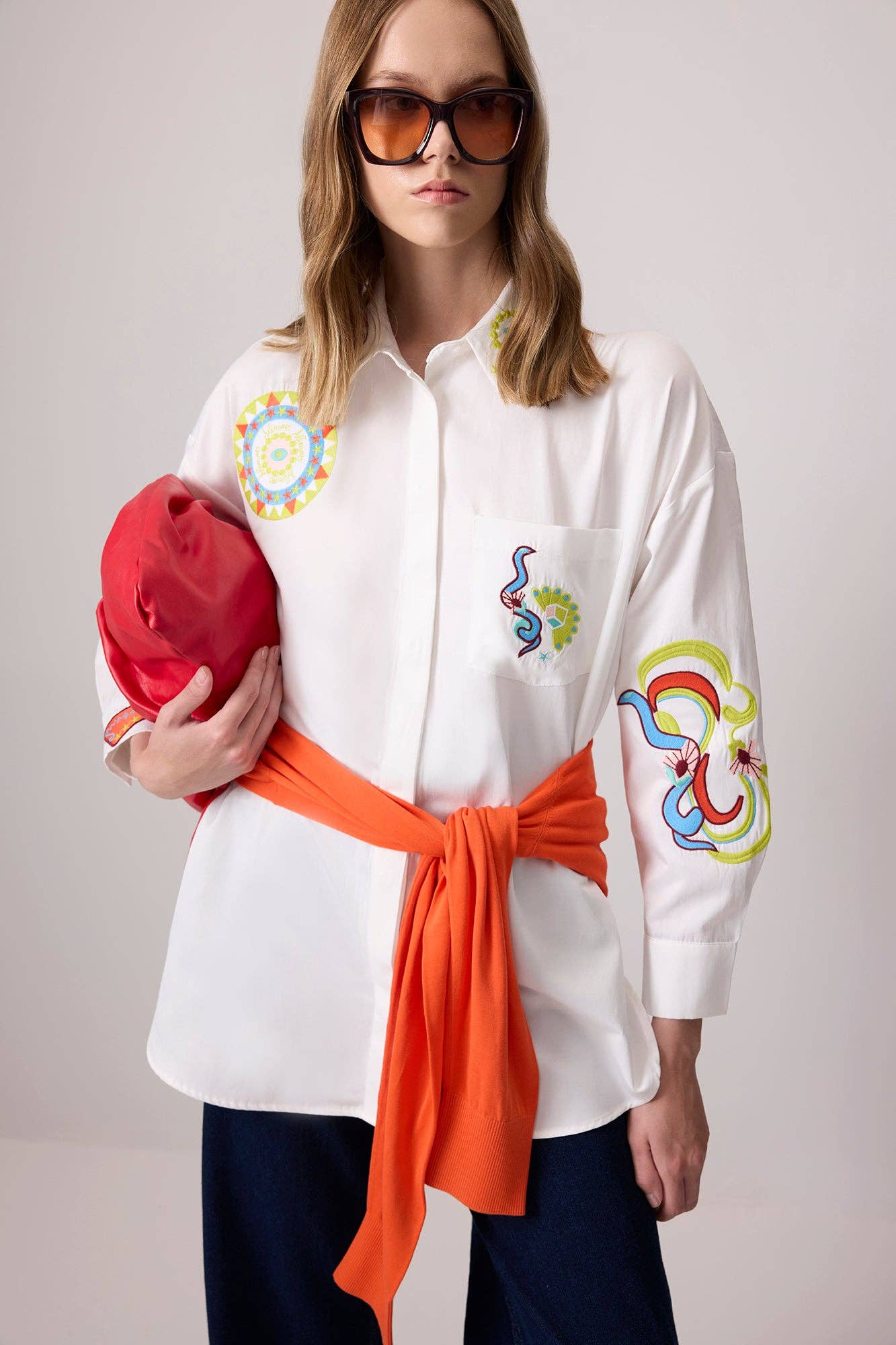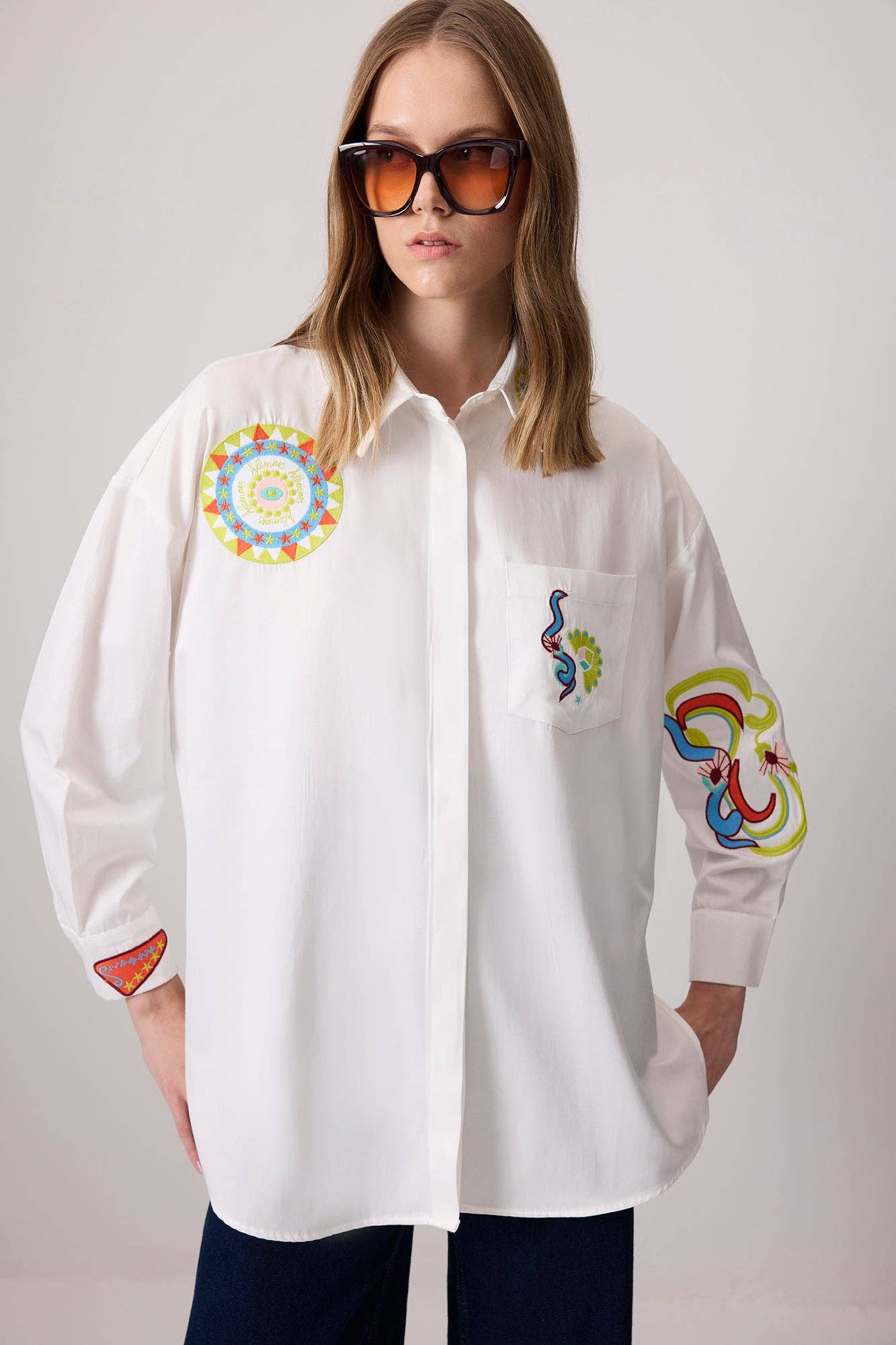 Turn heads with this playful and artistic embroidered oversized shirt, made from a breathable cotton-polyester blend (50% Cotton, 50% Polyester). Featuring colorful and whimsical embroidery on the chest, collar, and sleeves, this shirt blends modern streetwear with a bohemian twist. The relaxed silhouette, classic collared neckline, and button-down front offer all-day comfort while making a bold statement. Style it with wide-leg jeans, trousers, or even shorts for a standout look that’s perfect for art festivals, casual brunches, or creative office days. A vibrant staple for lovers of expressive and wearable art.