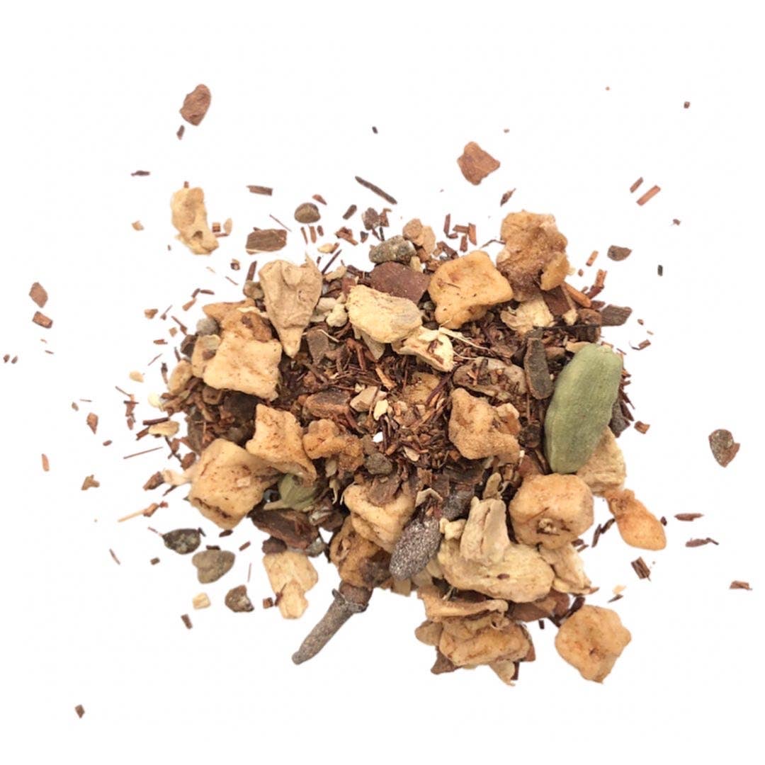Ingredients: Dried diced apples, ginger, cardamom, cloves, cinnamon nutmeg, red rooibos.