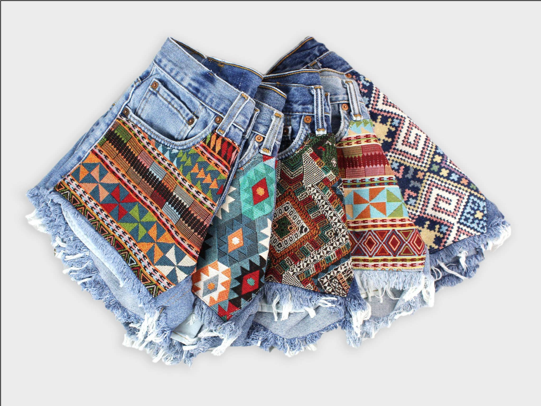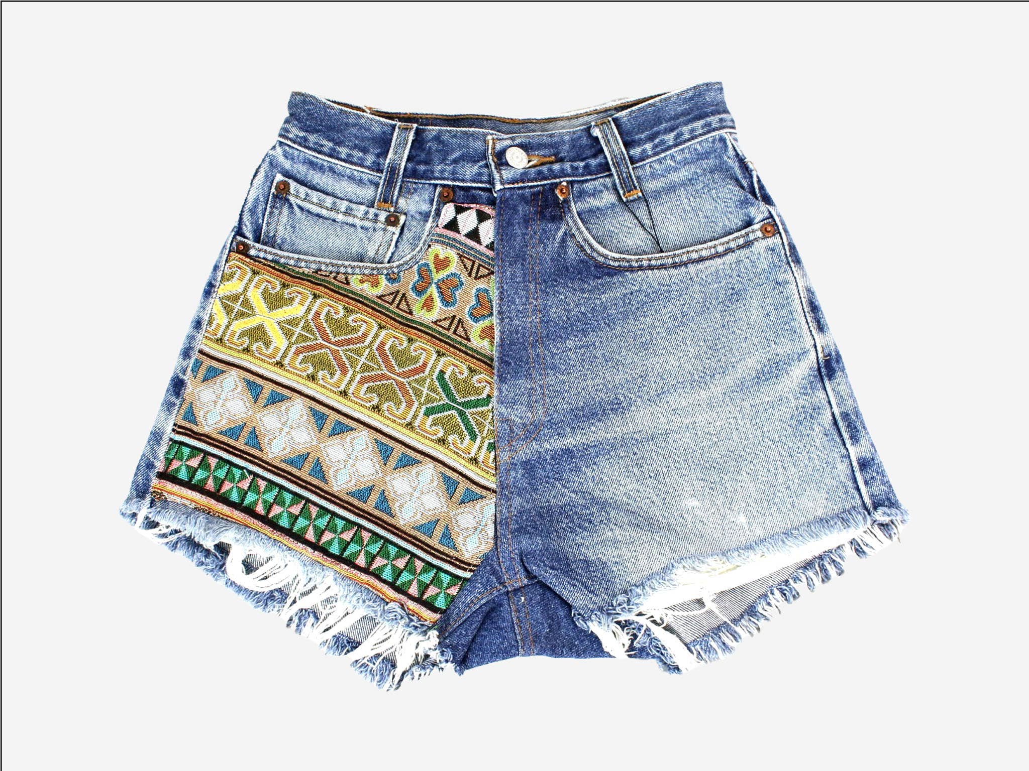 Each pair is re-tailored from a secondhand pair of jeans, giving them new life and an updated fit. Denim shades vary, and most original hardware is in-tact. Each one is unique! Recycled Tapestry Collection: Ideal for boutiques or stores looking to offer customers exclusive, trend-forward pieces with an eco-conscious twist. Take advantage of open sizing to create your own assorted bundle, or stock one of these suggested packs: 12-pack (standard), 2-2-2-2-2-2, (size 00-8) 12 -pack (alternate), 1-1-2-2-2-2-1-1, (size 00-12) 16-pack, 2-2-2-2-2-2-2-2, (size 00-12) Condition: Denim is washed. Item is generally in good condition. Like all secondhand/vintage clothing, it shows some wear, but there are no outstanding flaws. Typical characteristics of this product may be fading, fraying, distressed marks, small stains/discoloration. sku #512, High-Rise Tapestry Denim Shorts