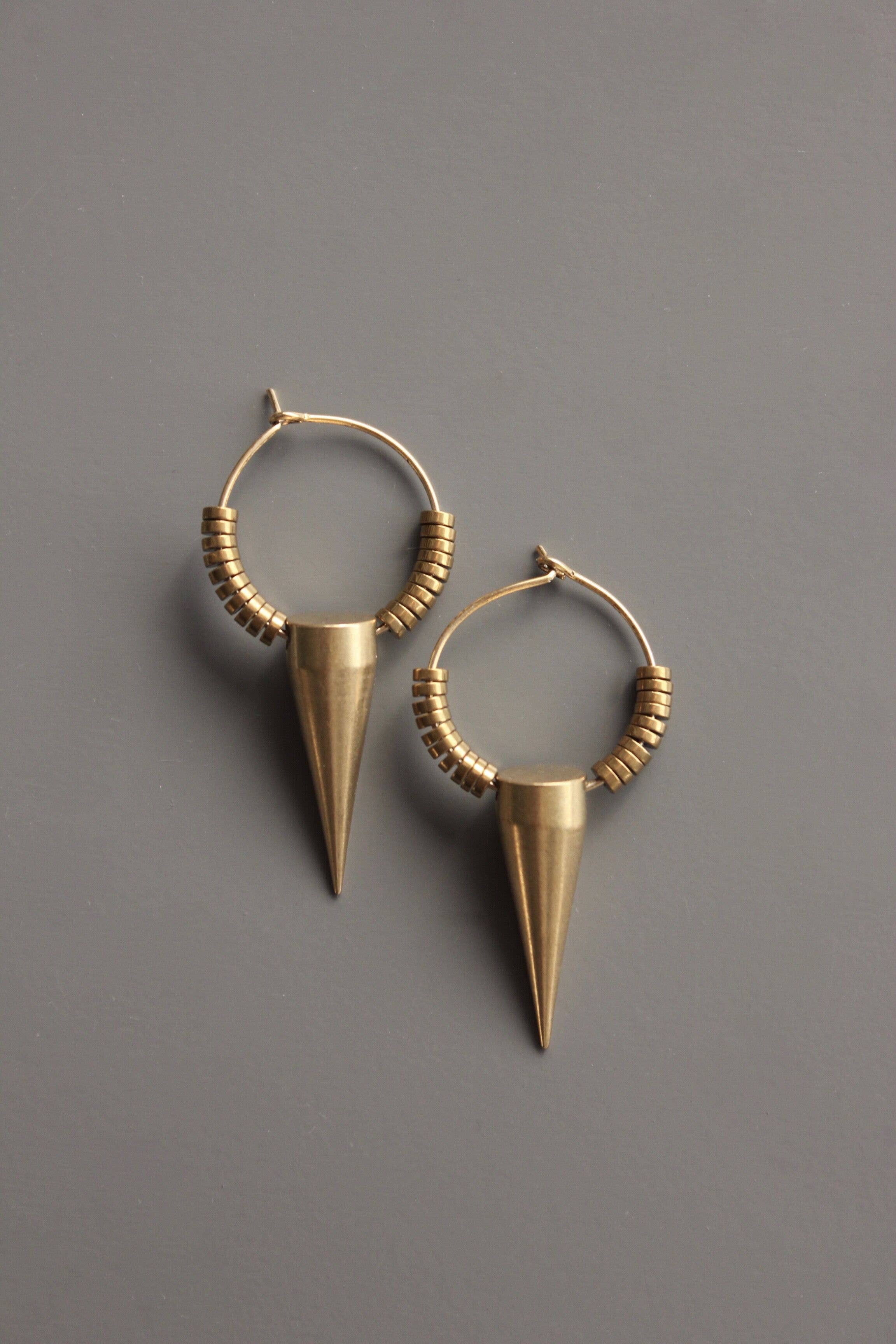 18k gold plated small brass hoop earrings with plated hematite and brass spikes. 1.5 inches.